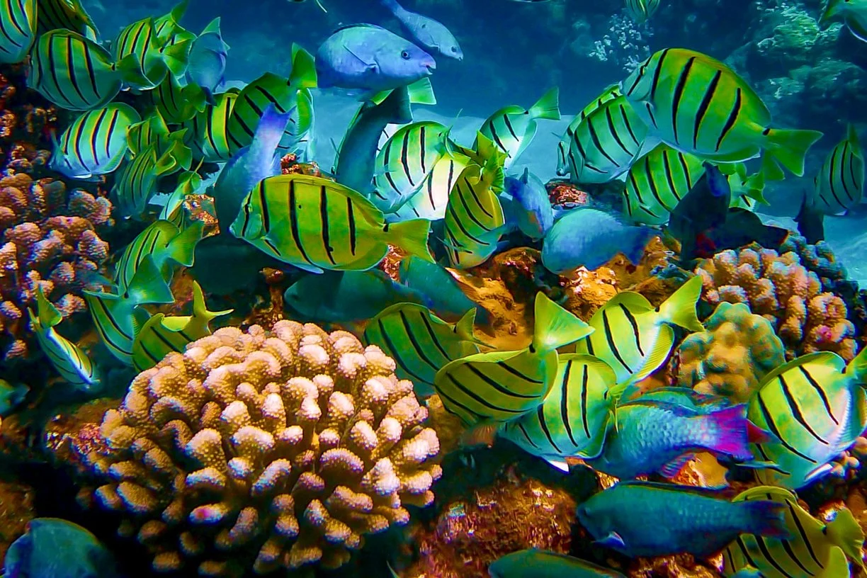 Convict Tang (Manini), Parrot Fish (Uhu) and Cauliflower Coral decorate this frenzied scene as fish scour for food along an active Hawaiian reef.